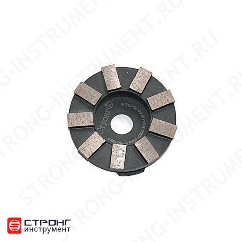 Алмазная фреза СТРОНГ - предназначена для шлифования свежих бетонов, мозаичных полов. Комплект из 6-ти фрез №0 при снятии 1 мм показывает ресурс 500-800 м.кв. При шлифовке на сухую с применением промышленного пылесоса ресурс на 20-30% выше. Диаметр фрез 95 мм.