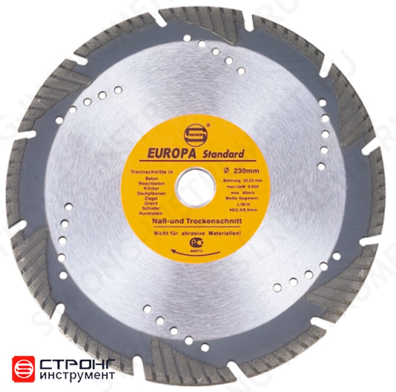 Стальной диск с эффективной режущей кромкой, выполненной по типу турбо-сегмент. Сегменты разделены промывочными канавками. На теле диска имеются коменсационные отверстия. Отлично справляется с задачей резки минеральных оснований и других твердых и особо твердых материалов. Гарантирует ровный, гладкий и точный рез без дефектов. Предназначен для работы УШМ или плиткорезом. Турбированная поверхность кромки при вращении создает воздух, тем самым охлаждая алмазный слой и ускоряя рабочий процесс. Надежен и безопасен в применении. Имеет большой ресурс работы.