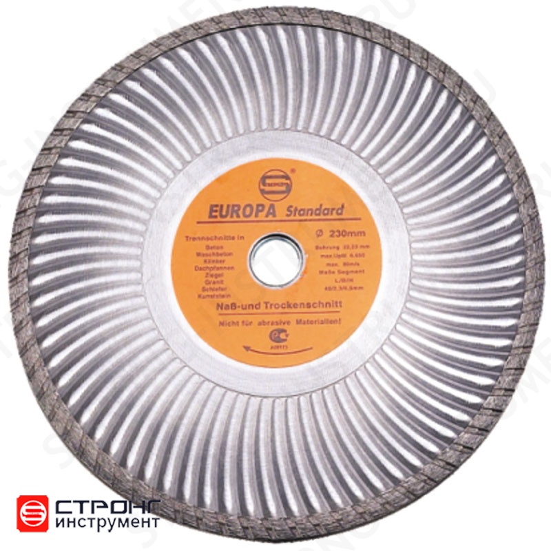 Имеет прочное стальное тело с волнообразным профилем и сплошной турбированной режущей кромкой. Характеризуется экономичным энергопотреблением. Идеальное решение как для сухой резки, так и для резки с водой. Волнообразная форма поверхности диска предупреждает перегрев алмазного слоя, способствует более интенсивному отводу отработанного материала и эффективно гасит вибрации, снижая тем самым нагрузку на рабочий инструмент. Подходит для резки бетона, плитки, кирпича, камня и многих других твердых и среднеабразивных материалов.