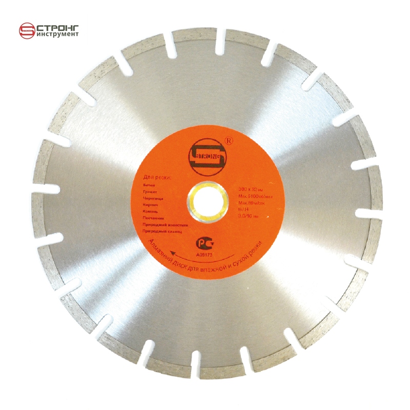 Износостойкий высокопроизводительный стальной диск с сегментированной режущей кромкой, на поверхность которой нанесен алмазный слой. Имеет высокую скорость резки и большой срок службы. В случае засаливания может быть быстро восстановлен посредством нескольких резов по абразивному материалу с однородной структурой. Наличие множества радиальных прорезей по всему контуру диска обеспечивает дополнительное и весьма эффективное охлаждение в процессе работы. Оптимальный вариант для использования совместно с бензорезом.