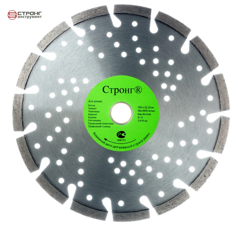 Используется для резки особо прочных минеральных оснований. Имеет литое высокопрочное стальное тело с сегментированной гладкой режущей кромкой, на поверхность которой нанесено специальное алмазное напыление. Сегменты надежно приварены к основе посредством лазера. Многочисленные компенсационные отверстия на теле диска обеспечивают эффективное охлаждение, что позволяет использовать его на сухую. Характеризуется низким энергопотреблением, хорошей износостойкостью, большим рабочим ресурсом и высокой производительностью.