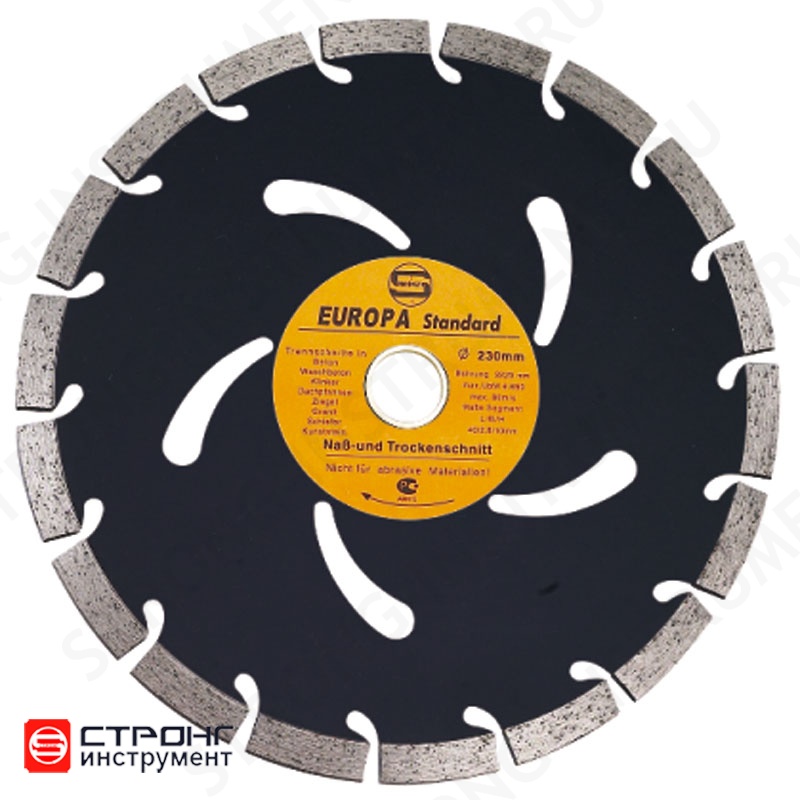 Диск алмазный сегмент Master имеет большое количество сегментов на режущей кромке и отверстия на теле. Быстро режет даже твердые материалы и отлично охлаждается в процессе эксплуатации. Оптимальный вариант для сухого реза с применением УШМ. Выдерживает непрерывную эксплуатацию с течение длительного времени. При засаливании диска необходимо выполнить несколько резов по твердому однородному абразивному материалу, что быстро восстановит его прежнюю режущую способность. Характеризуется большим рабочим ресурсом и высокой скоростью резки.