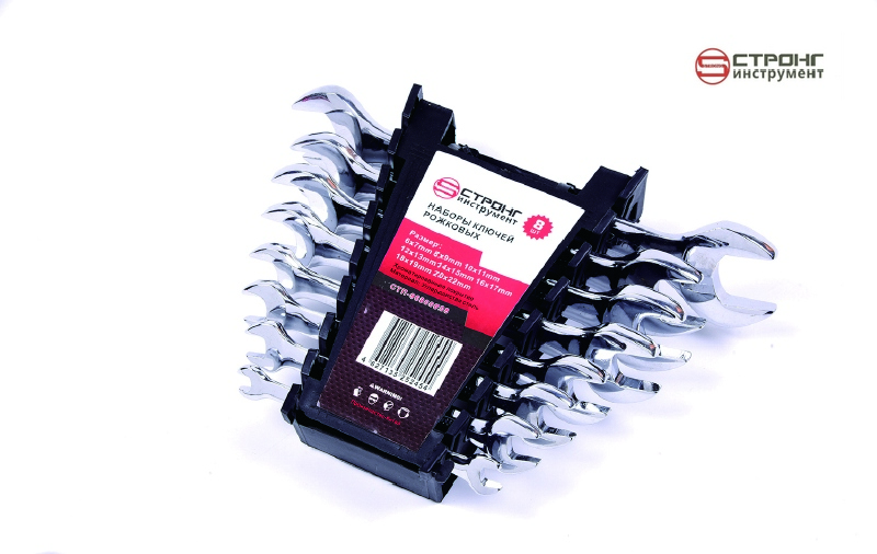 Набор ключей рожковых СТП-968 используется для обработки резьбового крепежа. Материал изделий – хромованадиевая сталь, надежная и долговечная в эксплуатации. Поверхность инструментов покрывается нихромом для защиты от коррозии.