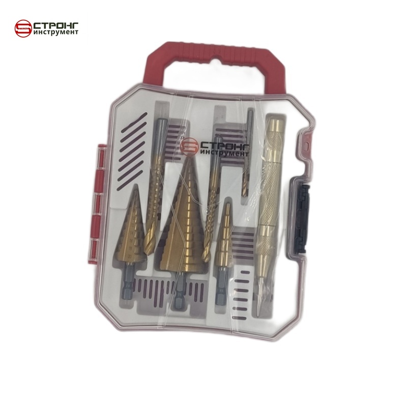Набор ступенчатых, кернер и фрезеровальных сверл + кейс для хранения. Ступенчатые сверла изготовлены из инструментальной быстрорежущей стали P6M5 с титановым покрытием. Каждое сверло имеет шестигранный хвостовик и угол заточки 118 градусов. Позволяют быстро получать отверстия различного диаметра от 4 до 32 мм, не меняя при этом насадки. Каждый следующий размер имеет плавный переход в виде ступеньки, что позволяет получать аккуратное отверстие нужного диаметра. Идеально центрируют отверстие. Сверла совместимы с разными моделями станков и дрелей (сверлильный станок, ручная дрель, аккумуляторная дрель). Набор из ступенчатых сверл - отличная замена такому инструменту как зенкер. Эта насадка для ремонтного и домашнего использования необходима в инструментальной оснастке каждого мужчины столяра электрика профессионала и частного мастера.